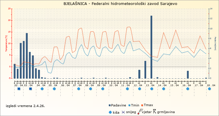 IZGLEDI VREMENA ZA PERIOD 03.04.2026. – 16.04.2026. Kiša u nižim, snijeg u višim, povremeno jači udari vjetra i temperature zraka niže u odnosu na prosječne za ovo doba godine na prostoru Bosne i Hercegovine zadržaće se još u petak. Od subote izgledna je stabilizacija vremenskih prilika i porast temperature zraka, naročito njenih maksimalnih vrijednosti. Početkom sljedeće sedmice temperature će u nižim područjima uglavnom biti iznad 20°C. Minimalne temperature zraka varirat će uglavnom između 2°C i 8°C u Bosni, u Hercegovini od 7°C do 12°C. Najviše dnevne temperature između 15°C i 21°C u Bosni, na području Hercegovine od 18°C do 23°C. Nakon kratkog porasta temperature i južine, opet će doći do promjene vremena. U preiodu od 10. aprila do kraja prognoznog perioda prema raspoloživim prognoznim modelima prognozira se nestabilno vrijeme i padavine u obliku kiše. Neće to biti cjelodnevna kiša ali će kišobran biti poželjan. Jutarnje temperature variraće uglavnom između 4°C i 9°C u Bosni do 12°C u Hercegovini, najviše dnevne između 10°C i 16°C u Bosni do 19°C u Hercegovini.