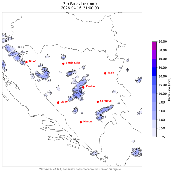 U ponedjeljak 16.03.2026., sunčano uz postepeno naoblačenje poslije podne i tokom noći. U drugom dijelu dana lokalni pljuskovi se očekuju ponegdje u Hercegovini, zapadnim i centralnim područjima Bosne. Vjetar slab na jugu i jugozapadu jugozapadni, a u ostatku zemlje istočni i sjeveroistočni. Jutarnja temperatura zraka od 2 do 8, a dnevna od 12 do 18, na jugu do 20 °C.